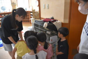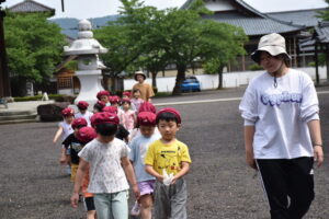 玄関で飼っていたボタンインコのキーちゃん(黄色のインコ)が死んでしまいました。早朝にバタバタッと羽ばたきして、パタッと動かなくなったそうです。キーちゃんとミーくん(緑色のインコ)の二羽は生後すぐにきたので7年半ぐらいだと思います。寿命といえばそれまでですが、新入園児が「チュンチュン」といって玄関から園に入りやすくなったり、毎朝登園してきた子が「おはよう」と声をかけたりしていました。もちろん、毎日すみれ組がお世話を続けていました。大の仲良しだったキーちゃんとミーくん。ミーくんは動かなくなったキーちゃんにぴったり、寄り添っていました。すみれ組さんがティッシュに包んで園庭で以上児クラスのみんなもお別れしました。ご本山のお墓に運んで手をあわせて「ありがとう」「さようなら」とお参りしました。「ミーくんだけになって、かわいそう」かわいがってあげましょうね。